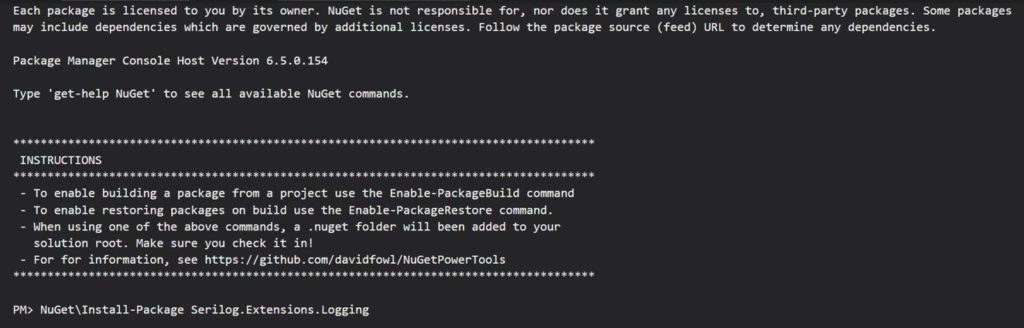 You can also install dependencies through the Package Manager Console. Simply select Tools NuGet Package Manager Console to accomplish this. The following commands are run to install Serilog requirements. The console is brought up.